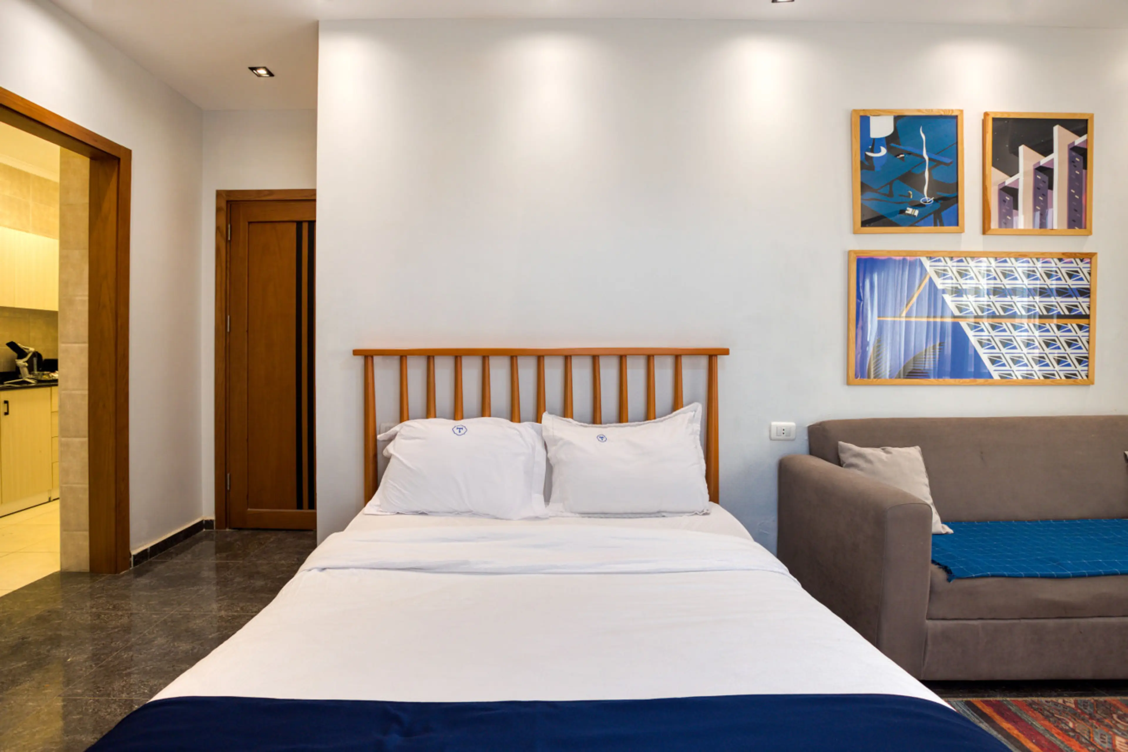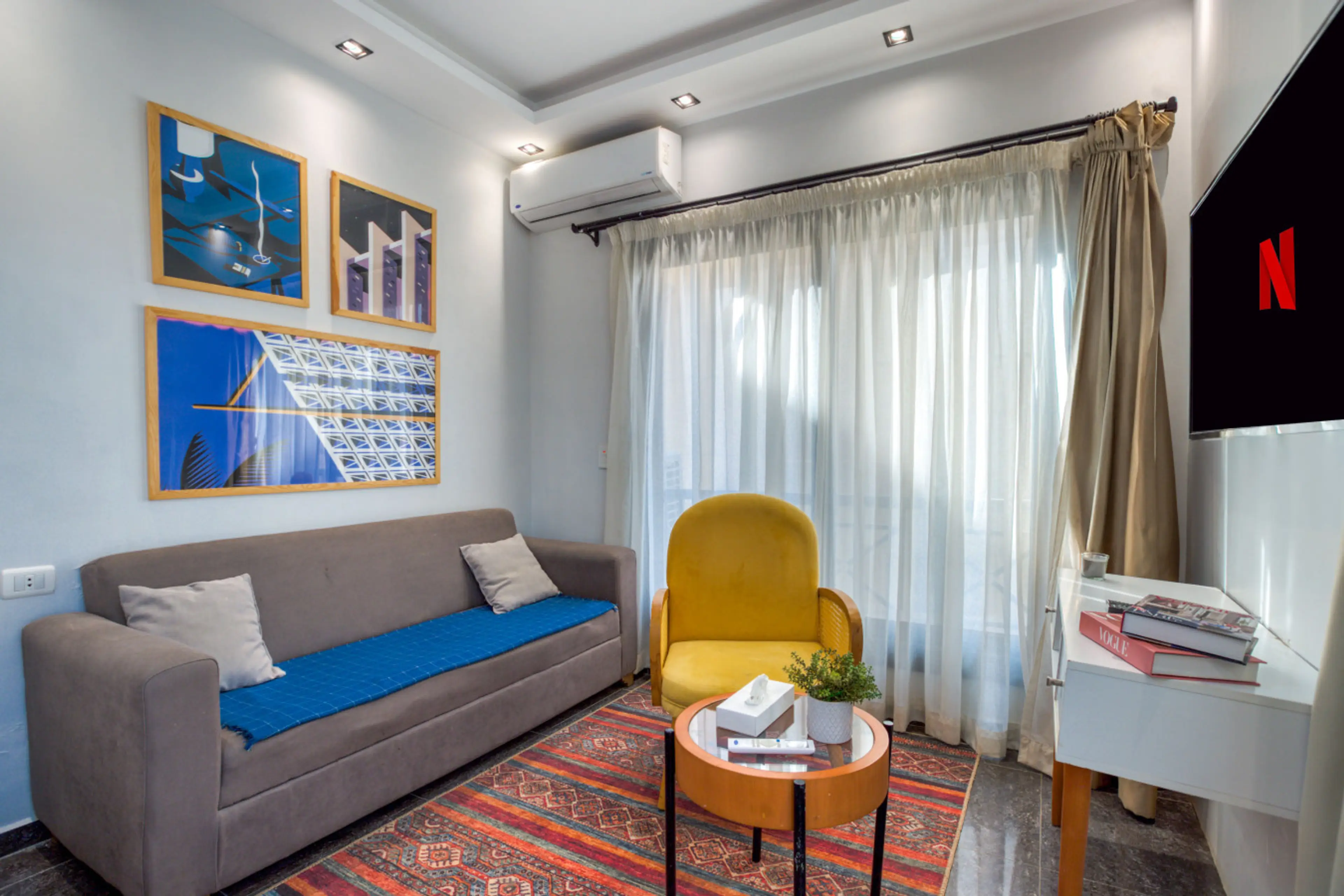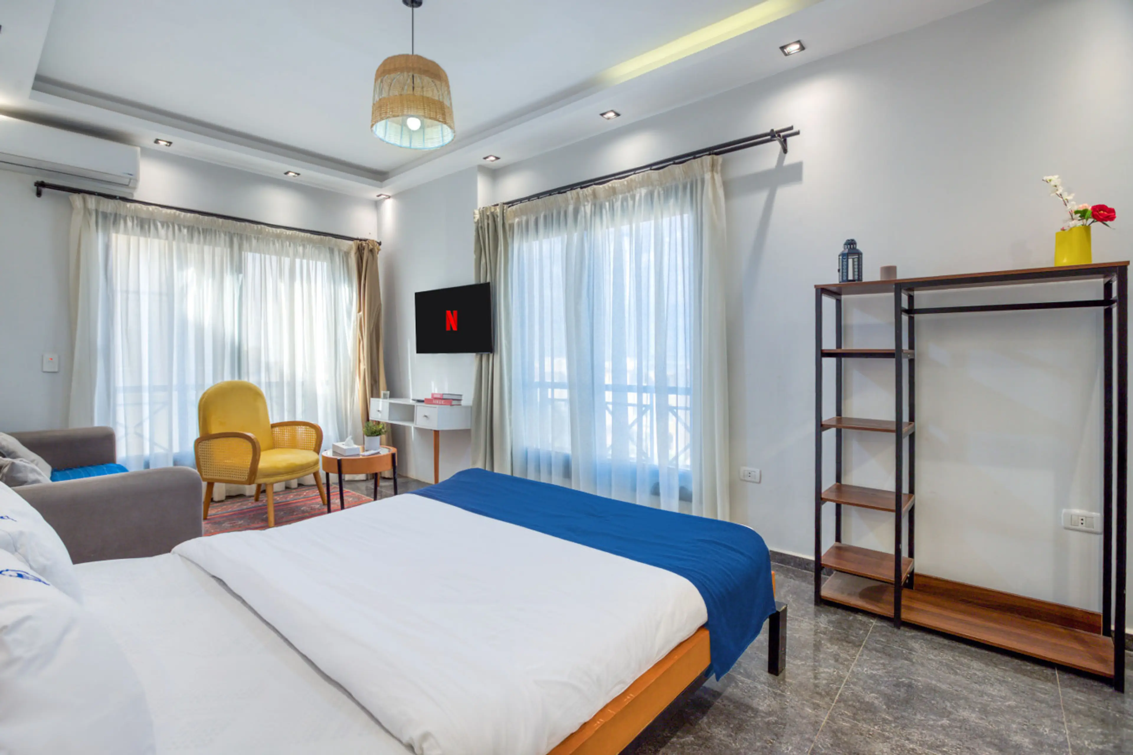 Welcome to Boho Heaven Studio by Travelholic! This cozy 50 sqm studio accommodates up to 3 guests with a queen bed and sofa bed. It features a Smart TV with free Netflix, WatchIt, and Shahid. The kitchenette is fully equipped with an electric stove, mini fridge, microwave, and utensils. Enjoy ai...