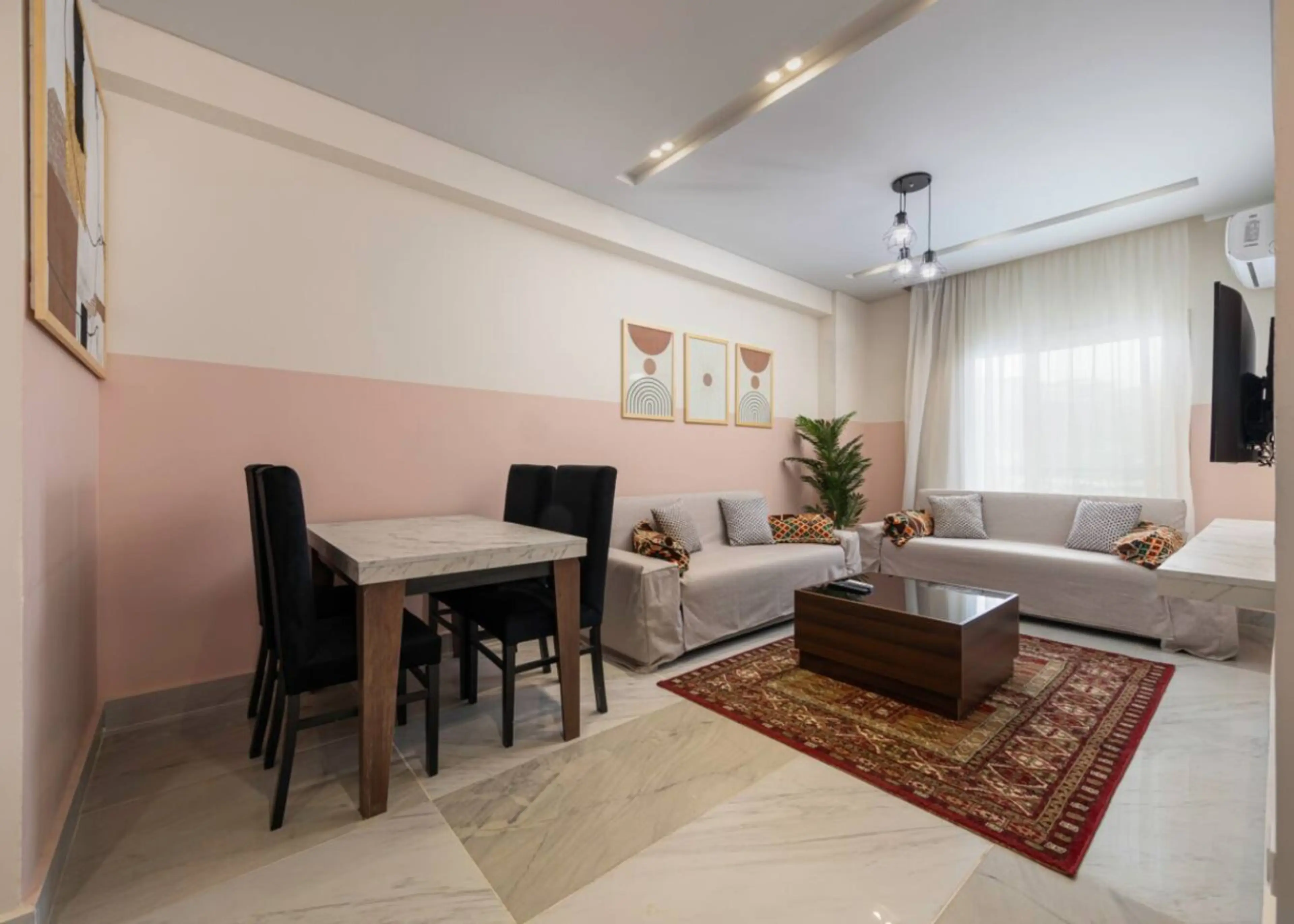 Welcome to Garden Boho 2BR Apt by Travelholic! This 90 sqm retreat accommodates up to 5 guests with 2 bedrooms (queen bed, 2 single beds) and a cozy living area with a Smart TV offering free Netflix, WatchIt, and Shahid. The fully-equipped kitchen has a microwave, fridge, and electric stove, while...